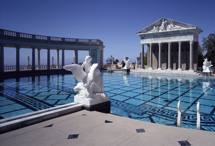 Hearst Castle is located in San Simeon, California. Designed by William Randolph Hearst and Julia Morgan, the first woman to graduate from the École des beaux-arts de Paris, it was built between 1919 and 1947. Inside, there are 56 bedrooms, 61 bathrooms and two swimming pools that do not reflect the splendour and opulence of the area. The outdoor Neptune pool is 32 m long and inspired by ancient architecture with its nereids and marble statues. The indoor swimming pool is surrounded by mosaics, reminiscent of the Roman baths